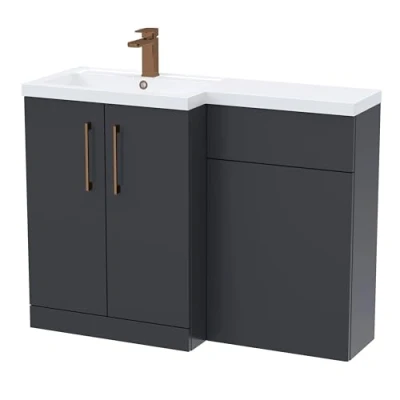 ManoManoBalterley Satin Dark Grey Bathroom Vanity Unit with Basin & WC, Brushed Bronze Handles, Left Hand, 1100mm x 390mm Perfect for cloakrooms, ensuites, and smaller bathrooms, this floor-standing combination unit offers ample storage for all your essentials. With a matching WC unit and vanity basin unit complete with basin and worktop, it brings a modern, elegant look to any space. It’s also available in both left-hand and right-hand options to suit your bathroom layout perfectly. Transform your bathroom into a stylish, organised, and calming space with this beautifully coordinated vanity basin and WC combination unit. Designed to bring both elegance and everyday practicality into your home, it creates a seamless, clutter-free environment that enhances the way you use your bathroom. Product Highlights: Space Saving: Perfect for cloakrooms, ensuites, and smaller bathrooms, this unit provides practical storage without compromising on style. Satin Dark Grey: A smooth satin dark grey surface