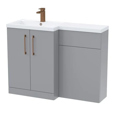ManoManoBalterley Satin Grey Bathroom Vanity Unit with Basin & WC, Brushed Bronze Handles, Left Hand, 1100mm x 390mm Perfect for cloakrooms, ensuites, and smaller bathrooms, this floor-standing combination unit offers ample storage for all your essentials. With a matching WC unit and vanity basin unit complete with basin and worktop, it brings a modern, elegant look to any space. It’s also available in both left-hand and right-hand options to suit your bathroom layout perfectly. Transform your bathroom into a stylish, organised, and calming space with this beautifully coordinated vanity basin and WC combination unit. Designed to bring both elegance and everyday practicality into your home, it creates a seamless, clutter-free environment that enhances the way you use your bathroom. Product Highlights: Space Saving: Perfect for cloakrooms, ensuites, and smaller bathrooms, this unit provides practical storage without compromising on style. Satin Grey: A sleek satin grey surface paired with a