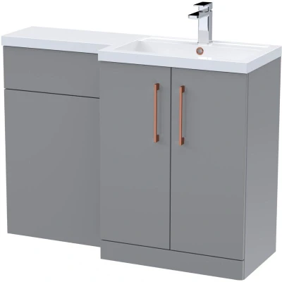 Balterley Satin Grey Bathroom Vanity Unit with Basin & WC, Copper Handles, Right Hand, 1100mm x 390mm Perfect for cloakrooms, ensuites, and smaller bathrooms, this floor-standing combination unit offers ample storage for all your essentials. With a matching WC unit and vanity basin unit complete with basin and worktop, it brings a modern, elegant look to any space. It’s also available in both left-hand and right-hand options to suit your bathroom layout perfectly. Transform your bathroom into a stylish, organised, and calming space with this beautifully coordinated vanity basin and WC combination unit. Designed to bring both elegance and everyday practicality into your home, it creates a seamless, clutter-free environment that enhances the way you use your bathroom. Product Highlights: Space Saving: Perfect for cloakrooms, ensuites, and smaller bathrooms, this unit provides practical storage without compromising on style. Satin Grey: A sleek satin grey surface paired with a white
