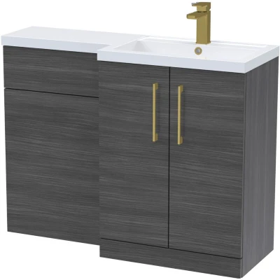 Balterley Woodgrain Anthracite Bathroom Vanity Unit with Basin & WC, Brushed Brass Handles, Right Hand, 1100mm x 390mm