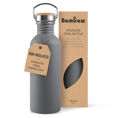 Bambaw Stainless Steel Water Bottle 750ml, Grey Bottle, Non Insulated 750ml Metal BPA Free Leak Proof Bottles, Reusable Stormy