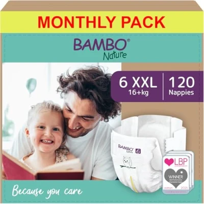 SUPER ABSORBENT: Size 6 Nappies that won’t let you down; Our intelligent channel system absorbs moisture to ensure a dry surface against your baby’s skin; Added leakage protection & wetness indicator SECURE & COMFORTABLE: Using flexible material; we designed these Premium Nappies with your child’s comfort in mind; Super-soft & fully breathable so your baby can stay active & sleep comfortably ECO-LABELLED: Now available in new 100% recyclable paper packaging. Because you care about the environment, we make our baby Nappies from responsibly sourced raw materials to limit the impact on the environment - FSC & Nordic Swan Ecolabel certified. SKIN FRIENDLY: These hypoallergenic Bambo Nature Premium Eco Nappies have been Asthma Allergy approved to keep your child safe; Free of parabens; perfume & preservatives; containing no known allergens CHEMICAL FREE: Extra-soft Bambo Baby Nappies free from chlorine; Phthalates; optical brighteners; PVC; heavy metals & organotins; No harmful chemicals have been used to make your child’s nappies