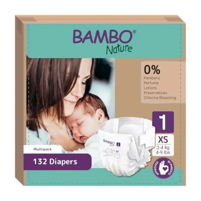 Bambo Nature Premium Eco Nappies, Labelled Newborn Enhanced Leakage Protection, Secure & Comfortable Baby Essentials Size 1 Nappies (4 9 lb/2 4 kg), 132PK