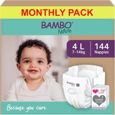 Bambo Nature Premium Eco Nappies, Labelled Sustainable Enhanced Leakage Protection, Secure & Comfortable Baby Size 4 Nappies (15 31lb/7 14 kg), Maxi, 144PK