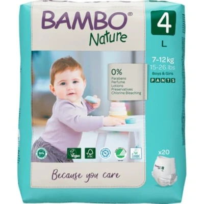SUPER ABSORBENT: Nappy Pull Ups that won’t let you down. Our intelligent Top Dry system absorbs moisture ensuring a dry surface against your child’s skin. Leakage protection & wetness indicator SECURE & COMFORTABLE: Using flexible material, we designed these Premium Training Pants for your child’s comfort. Super-soft & fully breathable so your baby can stay active & sleep comfortably ECO-LABELLED : Because you care about the environment we make our baby Nappies from responsibly sourced raw materials to limit the impact on the environment - FSC & Nordic Swan Ecolabel certified SKIN FRIENDLY: These hypoallergenic Bambo Nature Premium Pull Ups have been Asthma Allergy approved to keep your child safe. Free of parabens, perfume & preservatives, containing no known allergens CHEMICAL FREE: Extra-soft Bambo Nappy Pants free from chlorine, Phthalates, optical brighteners, PVC, heavy metals & organotins. No harmful chemicals have been used to make your child’s nappies