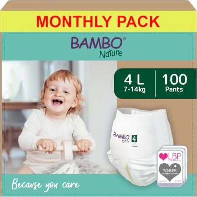 Bambo Nature Premium Training Pants, Pull Ups Eco Labelled Potty Nappy Secure, Comfortable, Discreet Pants For Active Day & Comfy Night's Sleep Size 4/L 7 14kg, 100PK