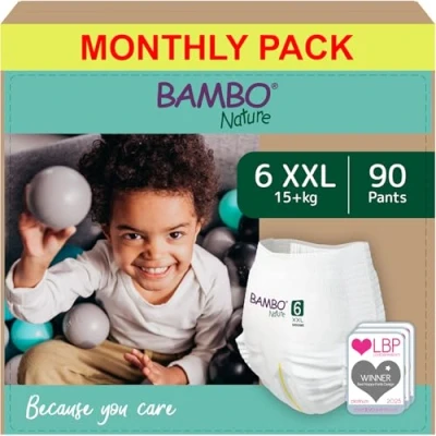 SUPER ABSORBENT: Nappy Pull Ups that won’t let you down. Our intelligent Top Dry system absorbs moisture ensuring a dry surface against your child’s skin. Leakage protection & wetness indicator SECURE & COMFORTABLE: Using flexible material, we designed these Premium Training Pants for your child’s comfort. Super-soft & fully breathable so your baby can stay active & sleep comfortably ECO-LABELLED: Now available in new 100% recyclable paper packaging. Because you care about the environment, we make our baby Nappies from responsibly sourced raw materials to limit the impact on the environment - FSC & Nordic Swan Ecolabel certified. SKIN FRIENDLY: These hypoallergenic Bambo Nature Premium Pull Ups have been Asthma Allergy approved to keep your child safe. Free of parabens, perfume & preservatives, containing no known allergens CHEMICAL FREE: Extra-soft Bambo Nappy Pants free from chlorine, Phthalates, optical brighteners, PVC, heavy metals & organotins. No harmful chemicals have been used to make your child’s nappies