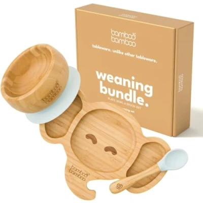 BAMBOO WEANING SET – this charming Elephant sectioned baby plate, suction bowl and weaning spoon set transforms mealtimes into an exciting experience, captivating children with fun characters and encouraging independent eating and exploring of new foods BABY SUCTION DISHWEAR FOR TODDLERS - the bamboo bamboo suction grip is near enough impossible for little ones to remove, but parents can simply lift the release tab. Our suction plates and bowls for babies weaning prevents flips, tips and spills, with rounded edges ideal for learning to scoop - helping children develop their eating skills with ease BABY WEANING SET 6 MONTHS - our baby weaning sets are specially designed for babies going through the weaning phase and are baby weaning essentials, facilitating the transition to solid foods SOLVE THE PLASTIC PROBLEM WITH BAMBOO - our toddler plates and bowls sets are made from natural, organic bamboo, which can grow to full size in just 3-4 months - a sustainable alternative to plastic or wood. Plus, nasty pesticides and chemicals aren't required when harvesting bamboo, so cultivation is natural and doesn't harm the environment THE PERFECT BABY SHOWER GIFTS - our baby feeding sets are perfect gifts for baby showers, mum to be gifts, new baby gifts, newborn baby gifts, pregnancy gifts, baby boy gifts, baby girl gifts, and gender reveal gifts