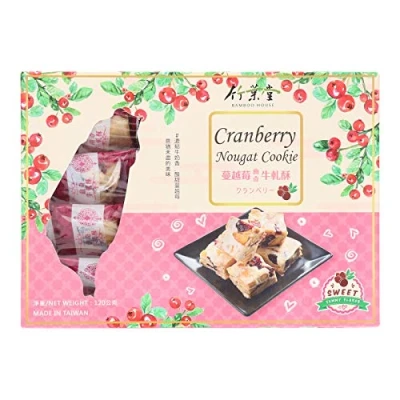 PREMIUM TAIWANESE SNACK — Combines the buttery crispness of cookies with the chewy richness of nougat, featuring sweet-tart cranberries for a delightful contrast of textures and flavors. AUTHENTIC FLAVOR PROFILE — Each bite offers a harmonious blend of sweet and tart, enhanced by the richness of nougat and the freshness of cranberries. READY-TO-EAT TREAT — No preparation needed — perfect for snacking, dessert plates, tea time, or gifting. CONVENIENT 120G PACK — Ideal size for sharing or personal indulgence; ensures freshness and easy storage. TRADITIONAL TAIWANESE SWEET — Experience authentic Taiwanese confectionery craftsmanship with this unique blend of Western-style cookie and soft nougat.