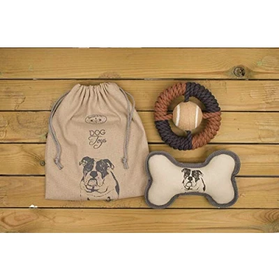 This Luxury Dog Gift Set is a unique gifting selection full of toys with different feels, textures and noises which will keep your dog entertained Inside this gift bag you will receive: 2 fun toys for playtime Features a drawstring close hessian bag to provide an easy but stylish storage solution, can be re-used for other items Neutral design to blend with home interior Types of toy - Multi-purpose rope and tennis ball wheel and a squeaky bone
