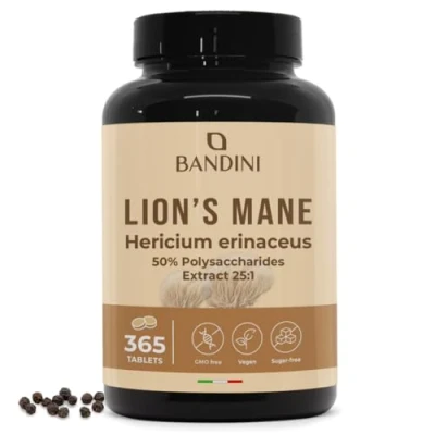 ❤️ 365 DAYS OF HIGH DOSAGE | Our lion’s mane tablets contain 2000mg of lions mane mushroom and provide 50% of the daily requirement of polyphenols. We have added the equivalent of 30mg of black pepper to our highly concentrated lion’s mane extract powder (25:1) to enhance bioavailability and absorption. Simply take 1 tablet per day for complete support and well-being. ✅ A NUTRIENT-RICH MUSHROOM | Lion's mane mushroom contains minerals including magnesium, phosphorus, potassium, selenium, vitamins and folate, and is particularly rich in vitamin B6. According to EFSA, folate and magnesium contribute to normal psychological function and selenium to the protection of cells from oxidative stress. In addition, vitamin B (B6) contributes to the normal function of the immune and nervous systems, to the synthesis of cysteine and to the metabolism of homocysteine. 👍 EASY TO SWALLOW VEGAN TABLETS | Hericium erinaceus, also known as lion’s mane mushroom or monkey’s head mushroom, is one of the most important medicinal mushrooms used in the millenary Ayurvedic tradition. We provide it in convenient tablets made from pure, 100% natural lion’s mane powder, produced under Good Manufacturing Practices and easy to swallow. 🔝 QUALITY TESTED | Our food supplement is high-quality, vegan, GMO-free and produced without unwanted additives, colourants or preservatives. Our food supplements do not contain ingredients of animal origin. We guarantee the highest level of safety and quality for all our products. 🏅 CERTIFIED PRODUCT | Bandini Pharma is an Italian company offering innovative and high-quality products for people's health and well-being, with a dynamic and professional approach: our products are manufactured in our GMP-, UNI EN ISO 9001:2015-, and ISO 22000:2018-certified laboratory. The Bandini Pharma line, made entirely in Italy, includes a wide range of products with excellent value for money.