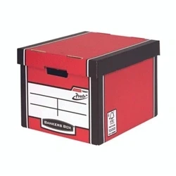 Bankers box with Presto instant assembly pop-up system for easy set up. Heavy duty box with two glued layers of carboard to all sides. Can be stacked up to 6 boxes high. Reinforced handles with anti-tear tape between the layers of cardboard.