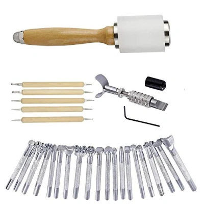 Leather Stamping Tool Including: 1x Carving hammer ,1x Rotating knife,5xTracing pen 20 X leather printing tools. Dimension:Wooden nylon hammer size:Length:8.2inch(210mm),width is 1.9 inch (50mm),Leather craft stamps length:4.2 inch(16mm),width:0.98 inch (25mm),carving knife length:3.3 inch(84mm),tracing pen length:5.1 inch (130mm) Rotating Knife :it is made of alloy steel,which is very nice and sharp although you do cutting into damp leather, and you can also change the angle at any time when you doing cutting. Leather Workingembossing tools:they are made of alloy steel, have 20 different printings, make your leather product more beatiful and unique.it is very easy to use. Tracing pen: wooden and steel.it is use for creating dots and details. Please Note: this set is a suitable for beginner, but not for perfectionist or extremist., Manufacturer: BANYOUR