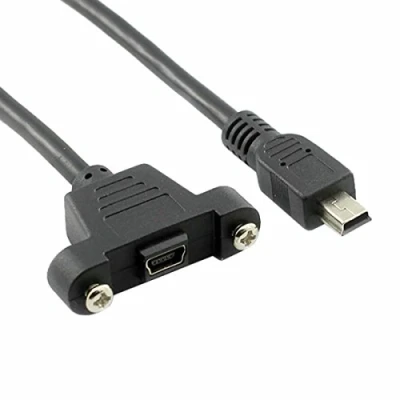 Panel Mount Mini USB B Cable with Screws , Screws distance is 28.00mm. Standard USB 2.0 High Speed Certified cable, backward compatible with USB 1.0/1.1 standards One USB B Mini male connector and one USB B Mini female connector, 4 Wires connected inside Works with existing charge and PC data transfer cables. Package include:1x1ft mini usb male to female cable with Screws