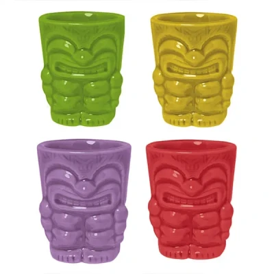 Perfect for serving classic aged rum, tequila or any short drink, this Bar Bespoke Ceramic Tiki Shots 4 Pack is great when entertaining in the home or garden. Tiki, being the Maori equivalent of Adam, dates back from the beginning of time. Tiki culture however is much more recent, having been influenced post World War II by returning American GIs who helped popularise the culture of the Pacific Islands. These coloured ceramic Tiki shot glasses reflect these original designs. These tough shot glasses are moulded into a classic Tiki shape and hold 50ml, enough for a generous shot.Wash by hand.Supplied in a smart gift box.