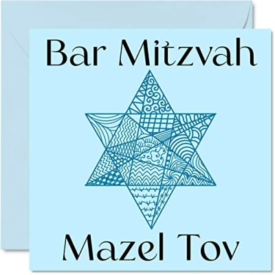 MAKE THEM @@@wowUxFiCONyMBxUD92wr9kYoSGDp0qJp@@@ WITH THIS HAPPY BAR MITZVAH FOR HIM: This exceptional quality Jewish Bar Mitzvah cards for her shows the design of the Star of David with the wording "Bar Mitzvah Mazel Tov". If you are looking for beautiful Jewish cards friends greetings cards, then this happy religious gifts is bound to make them smile. This could be an Bar Mitzvah card for Son, Brother, Nephew, Cousin, Grandson or Friend. WHAT DO YOU GET: The card is printed on one side and BLANK ON THE INSIDE to allow you to write your very own message. The unique fun design is printed on a specially sourced and environmentally responsible board. At 360 microns thick the natural white one-sided gloss board has a quality look and feel. Supplied with a coloured gummed envelope to complement the design and ready to be sealed and sent in the post. NO INK SMUDGES: There is nothing worse than writing inside a card to find that the shiny surface makes the ink smudge. This is why we use a high quality one sided coated board. The uncoated side will absorb more of the ink from your pen to make smudging a thing of the past. SIZES: Greeting Card = 145mm x 145mm, Envelope = 155mm x 155mm, Card Thickness = 360 micron. Great Jewish cards for all the family. Bat Mitzvah gifts, Bat Mitzvah card, Bat Mitzvah cards, Bar Mitzvah card, Bar Mitzvah cards. MADE AND QUALITY CHECKED IN THE UK: We print and manufacture all our product right her in the UK so you can be sure of a fast turnaround and a product that is expertly made. Using environmentally responsible premium board our card is conscious of the responsible management of the world's forests - good Luck gifts, congratulations cards.