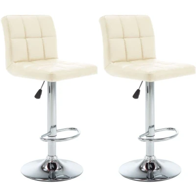 General description This bar stool set features an elegant and modern style, making it suitable for various spaces such as homes, offices, bars, and cafes. The stools are upholstered in quality artificial leather, providing a comfortable seating experience. The strong chromed steel frame ensures durability, while the practical gas lift mechanism allows for adjustable seating height. Additionally, the built-in footrest offers extra support and comfort. Technical specifications Colour: Cream Material: Artificial leather (60% PU, 30% polyester, 10% cotton), steel Dimensions: 40 x 47 x (90-111) cm (W x D x H) Base diameter: 38.5 cm Gas lift mechanism: Yes Height adjustable: Yes Assembly required: Yes Max. loading capacity: 110 kg Other information
