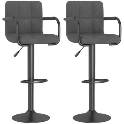 General description Enjoy a few sips of wine, grab a bite, or just relax while you sit on these stylish bar stools. Upholstered in soft-to-touch dark grey velvet, these bar chairs provide optimal seating comfort. The sturdy powder-coated steel frame ensures durability, while the built-in footrest enhances your seating experience. With a gas lift mechanism, the counter stools can be adjusted in height, making them a perfect addition to any functional bar or dining area. They also swivel 360 degrees for added flexibility. Technical specifications Colour: Dark grey Steel colour: Black Material: Powder coated steel, velvet (100% polyester) Dimensions: 48 x 47 x (90-111) cm (W x D x H) Seat width: 40 cm Base diameter: 38.5 cm Maximum weight capacity: 110 kg per seat 360 degrees swiveling: Yes Gas lift mechanism: Yes Built-in footrest: Yes Adjustable in height: Yes Armrests: Yes Assembly required: Yes Delivery contains: 2 x Bar stool Other information