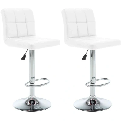 General description This bar stool set features an elegant and modern style, making it suitable for various spaces such as home, office, bar, and cafe. The seat and backrest are upholstered in quality artificial leather, providing a comfortable seating experience. The strong chromed steel frame ensures durability, while the practical gas lift mechanism allows for height adjustment. Additionally, the built-in footrest offers extra support and comfort. Technical specifications Colour: White Material: Artificial leather (60% PU, 30% polyester, 10% cotton), steel Dimensions: 40 x 47 x (90-111) cm (W x D x H) Base diameter: 38.5 cm Gas lift mechanism: Yes Height adjustable: Yes Max. loading capacity: 110 kg Assembly required: Yes Delivery contains 2 x Bar stool Other information