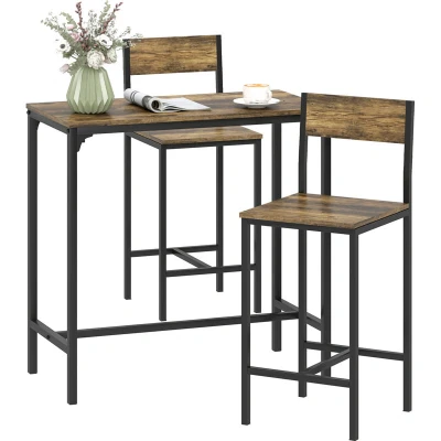 Discover the chic charm of HOMCOM's industrial bar table set, featuring a sleek rectangular table with two stools. Its rustic brown and black metal design adds a trendy touch to any space. Enjoy the comfort of supportive backrests and integrated footrests, great for daily dining or casual drinks. Plus, the space-saving design fits beautifully in small spaces, keeping your area neat and stylish. Specifications: ● Colour: Rustic Brown, Black ● Material: MDF, Metal ● Bar Table Size: 89L x 45W x 87H cm ● Bar Stool Size: 39L x 43W x 95H cm ● Seat Size: 39W x 38D x 64H cm ● Seat Back Size: 15W x 32.2H cm ● Weight Capacity: 60 kg (table), 120 kg (stool) ● Item Label: 835-135V00RB Features: ● Three-piece set includes a table and two stools for a complete dining setup ● Industrial design adds chic, modern home aesthetics ● Supportive backrests and footrests on stools boost sitting comfort ● Stools tuck under the table, maximising small space utility ● Robust MDF and metal frame ensure