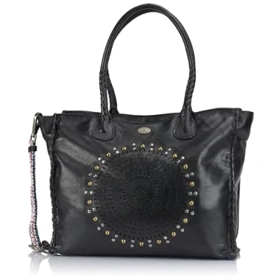 Casual leather shopper With fine cut-outs Assorted rivets Braided details Patterned and woven carrying strap