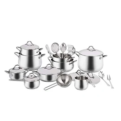 Material: 18/10 stainless steel, durable and hygienic The curved body allows each element maximum capacity The three-layer base made of steel-aluminium steel ensures optimal heat distribution Each item has a scratch resistant interior Made in Italy. The set consists of: 1 saucepan 20 cm, 1 saucepan 24 cm, 1 saucepan 26 cm, 1 saucepan 16 cm, 1 saucepan 20 cm, 1 saucepan 24 cm, 1 saucepan 24 cm, 1 milk kettle 1 1 Strainer. 14 cm; Lid: 14, 16, 20 (x2), 24 (x2) cm, 26 cm, 6 kitchen utensils, 1 universal steel cleaner
