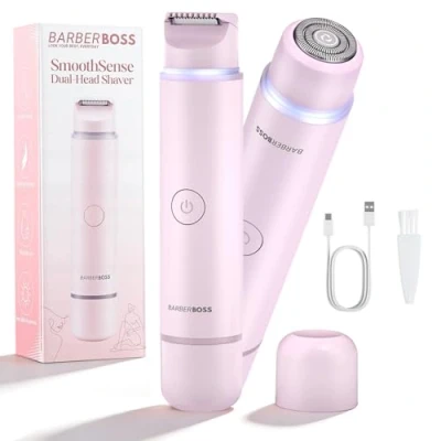 Complete Grooming Kit, Ideal Gift for Her: The Barberboss 2-in-1 Lady Shaver kit comes with everything needed for smooth, confident grooming. It has 1*Dual-Head Face & Body Trimmer, 2*Protective Covers, 1*Guide Comb for even trimming, 1*Cleaning Brush, and 1*USB Charging Cable. The elegant Pink finish adds a touch of style, making it a thoughtful gift for birthdays, holidays, or special occasions. 2-in-1 Dual-Head Shaver for Face & Body: The BarberBoss women’s electric shaver features an integrated 2-in-1 shaver - one for facial hair and one for body trimming offering smooth, precise grooming from top to toe. Its pink 2-in-1 design removes hair safely and comfortably from face, arms, legs, underarms, and bikini area, eliminating the need to swap heads. Smart Precision Light for Confident Detailing: Equipped with an integrated LED precision light that brightens contours and highlights fine hair, making it easy to see and shape with accuracy. Perfect for delicate zones like the bikini line, upper lip, and underarms even in low light. Skin-Friendly, Gentle Shaving: This women’s shaver uses hypoallergenic blades and a soft protective foil to deliver a close yet comfortable shave. The gentle blade glides smoothly over sensitive skin, helping prevent irritation, redness, or ingrown hairs leaving your skin smooth and soft after every use. USB-Rechargeable & Long Lasting Battery: Charge fully in just 2 hours for up to 60 minutes of cordless use. Recharge easily via any USB port, laptop, or power bank using the included cable. Compact and power-efficient perfect for both home and travel use. Lightweight, Portable & Easy to Clean: Designed for comfort and portability, this compact female 2-in-1 trimmer set fits neatly in your travel pouch or handbag. The included cleaning brush makes post-use maintenance quick, hygienic, and hassle-free.