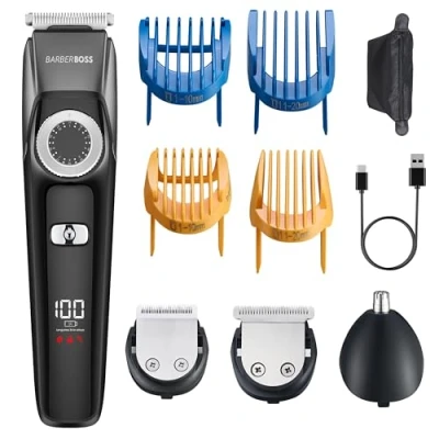 Complete 3-in-1 Men’s Grooming Solution: The BarberBoss men’s grooming kit combines a hair clipper, beard trimmer, and nose & ear trimmer in one versatile device. Supplied with four guide combs, a professional comb, hairdressing cape, USB charging cable, cleaning brush, and travel pouch, it’s designed for complete grooming at home or while travelling. Self-Sharpening Ceramic & Titanium Blades: Featuring a hybrid ceramic and titanium blade design, the cutting system maintains long-lasting sharpness. This ensures clean, accurate trimming with minimal snagging for a smoother, more comfortable grooming experience. Interchangeable Heads for Total Grooming: Easily change attachments to cut hair, maintain beards and stubble, or safely trim nose and ear hair. Built to handle both precision detailing and everyday grooming from head to face. Adjustable Length Control with Precision Dial: Achieve a close 0.5mm trim without a comb or extend up to 20mm using the included attachments. The adjustable control dial allows fine length tuning for consistent, personalised results. Smart LED Display & Long Battery Life: The integrated LED screen displays battery level, charging progress, and travel-lock status. A full 3-hour charge delivers up to 150 minutes of cordless performance. 100% Waterproof & Easy to Clean: Designed for wet and dry use, the waterproof construction allows heads to be rinsed directly under water after use. Detachable attachments and the included cleaning brush make upkeep quick and simple.