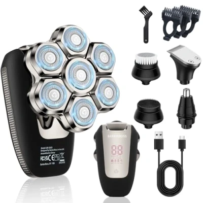 BarberBoss 7D Bald Head Shaver for Men Magnetic Rotary Shaver, 5 in 1 Electric Groomer with LED Display, USB C Charging, Beard & Nose Trimmer, All One Facial Grooming Kit QR 2025