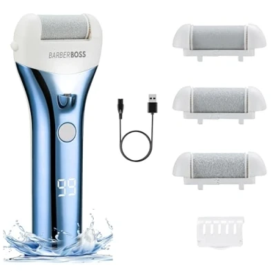 BarberBoss Callus Remover, Rechargeable Foot Smoother for Hard Skin Pedicure Kit with 3 Rollers, USB Charging, LED Display & Waterproof Design