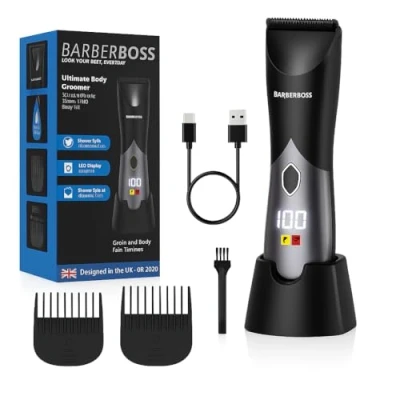 BarberBoss Cordless Beard Trimmer for Men, Body Groomer, Groin Hair Clipper with Adjustable Lengths, Wet/Dry Use & Smart Display, Rechargeable Grooming Kit Sensitive Areas