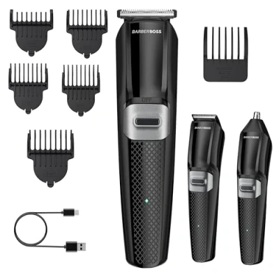 BarberBoss Cordless Grooming Kit for Men, Beard Trimmer, Hair Clipper & Nose Men’s 3 in 1 Facial Groomer with USB Charging