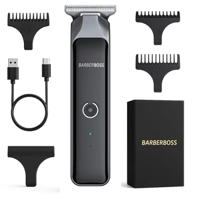 BarberBoss Cordless Hair Trimmer for Men, Beard T Blade Groomer, Waterproof Grooming Kit with 4 Guide Combs, LCD Display, USB Fast Charging, Face & Body Clipper (Black)