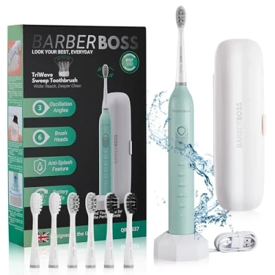 [REVOLUTIONARY OSCILLATING & VIBRATING TECHNOLOGY] Experience next-level oral care with our innovative servo system, delivering up to 60° oscillation. The advanced WAVE feature lets you customize your brushing with 40°, 50°, and 60° adjustable angles, designed to integrate the Bass Brushing Technique, ensuring deep, effective cleaning for every tooth surface. [6 PREMIUM BRUSH HEADS FOR CUSTOMIZED ORAL CARE] Tailor your brushing experience with three specialized brush head options: Regular, Whitening, and Sensitive (2 pairs each). Whether you need deep cleaning, stain removal, or gentle care, we’ve got you covered. [45 DAYS EXTENDED BATTERY LIFE] Enjoy up to 45 days of use on a single charge with the BarberBoss toothbrush. The wireless charging base ensures hassle-free charging, reducing the need for frequent recharges, perfect for home and travel. [SPLASH-PROOF DESIGN FOR MESS-FREE BRUSHING] Engineered with a gradual vibration start, increasing from low to high in the first 3 seconds to reduce splatter and ensure a clean, comfortable brushing experience. [TRAVEL-FRIENDLY & COMPACT DESIGN] Lightweight and portable, with hygienic travel caps and a durable travel case, ensuring effortless oral care at home or on the go. [WHAT’S INCLUDED] 1 toothbrush, 6 brush heads (Regular, Whitening, Sensitive), 6 hygienic travel caps, 1 charging base, 1 travel case, 1 user manual. Backed by a reliable warranty and friendly customer service for a seamless, hassle-free experience.