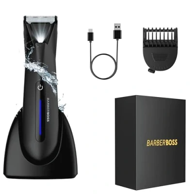 Complete Male Grooming Solution: The BarberBoss Men’s Intimate Grooming set includes a precision body hair trimmer, adjustable length comb, charging dock, USB cable, and cleaning brush. Designed to deliver a seamless head-to-toe grooming routine with every essential in one package. Designed for Full-Body Use: Perfect for grooming chest, underarms, legs, and private zones like the groin and pubic region. A built-in LED light improves visibility in low-light areas, helping you trim with confidence, even in harder-to-see spots. Skin-Friendly Ceramic-Titanium Blade System: Crafted with a dual-blade combination of ceramic and titanium, this trimmer offers ultra-close, 0.5mm trimming without guards. The rounded, R-edge blade is engineered to reduce irritation and ensure safe, smooth handling in delicate areas. Custom Trimming Lengths with Adjustable Comb: Features a dial-controlled comb with 6 length settings (2.5mm to 7.5mm), giving you the flexibility to personalize your grooming style and maintain consistent results across various body zones. Flexible Charging Options with Quick Power-Up: Charge using the USB cable or the included stand with any 5V1A port. It's compatible with laptops, power banks, and standard adapters. A full 1.5-hour charge provides up to 90 minutes of continuous grooming—perfect for daily use and travel. IPX7 Waterproof & Low-Maintenance Design: Fully waterproof and easy to clean. Simply detach the trimmer head, rinse it under running water, and brush off any loose hair. For optimal performance, dry the handle after use and occasionally oil the blade to maintain sharpness. Grooming On the Go, Ideal Gift Option: Featuring a sleek design, travel lock function, and cordless convenience, this grooming tool is tailored for men with active lifestyles. A practical and stylish gift for those who prioritize hygiene, comfort, and precision in their grooming routine.