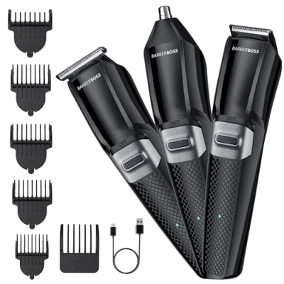 BarberBoss Men’s 3 in 1 Cordless Grooming Kit, Beard Trimmer, Hair Clipper, Nose and Ear Ceramic Titanium Blade, Facial Shaver