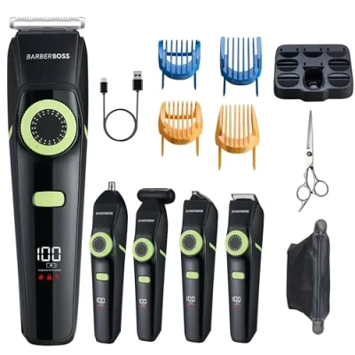 BarberBoss Men’s 5 in 1 Beard Grooming Kit, Cordless Hair Clippers for Men, Body & Ear,Nose Groomer, Detail Clipper with Precision Dial, Complete Facial Groomer