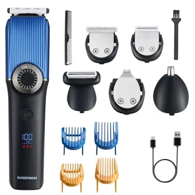 BarberBoss Men’s 5 in 1 Grooming Kit, Cordless Hair Clippers, Beard Trimmer Men, Body & Nose Groomer with Precision Dial, 39 Length Settings, Rechargeable Clipper