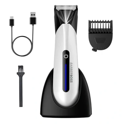BarberBoss Men’s Body Trimmer, Waterproof Groin & Ball Groomer, Skin Safe Ceramic Blade Hair Adjustable Comb, USB Charging Stand LED Light, Male Hygiene Trimmer