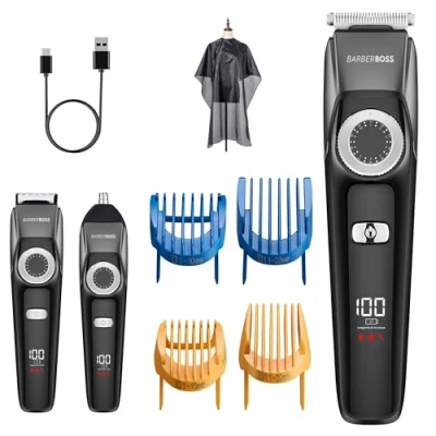 BarberBoss Men’s Cordless Beard Trimmer Kit, 3 in 1 Groomer for Men, Beard, Hair & Nose Clipper with Adjustable Dial, Ceramic Blades, Complete Grooming Kit