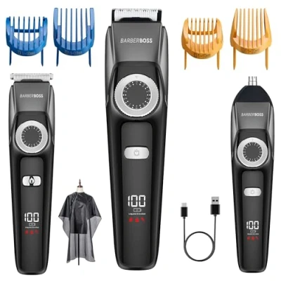 Barberboss Men’s Grooming Trimmer, Waterproof 3 in 1 Clipper, Hair, Beard & Nose Groomer with Adjustable Dial, LED Display, USB Charging Hair Kit for Men
