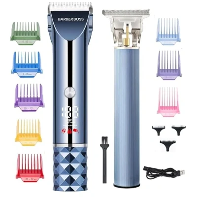 BarberBoss Men’s Hair & Beard Trimmer, Turbo Speed Groomer with LED Display, Adjustable Blade, 8 Guide Combs USB Rechargeable and Cordless Clipper Kit for Men
