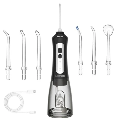 BarberBoss Portable Water Flosser, USB Rechargeable Oral Irrigator with 5 Pressure Levels, 6 Nozzles, 300ml Tank, Waterproof and Cordless Dental Flosser for Home & Travel