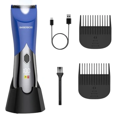 BarberBoss Rechargeable Body Hair Trimmer for Men, Blue Groin Shaver with Waterproof Design, LED Display, and Beard Groomer Adjustable Combs