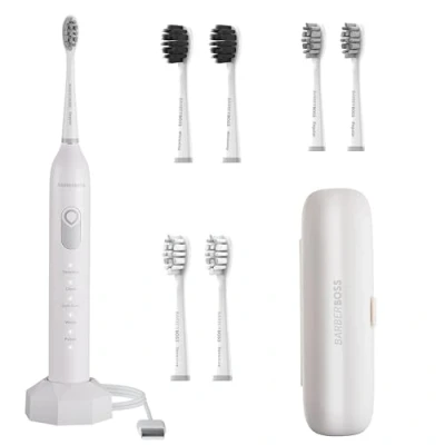 Complete Dental Care with an Electric Toothbrush: The BarberBoss electric toothbrush includes everything you need for professional oral hygiene: 1 sonic handle, 6 specialized brush heads (daily, whitening, and sensitive), 6 protective caps, a USB charging base, and a stylish travel case. Electric toothbrush with smart pressure sensor: Designed to protect your gums, this electric toothbrush activates only with the right amount of pressure. If you apply too much force, a gentle vibration alerts you and helps improve your brushing technique. Specialized brush heads for your electric toothbrush: Includes three types of brush heads for different needs: medium W-shaped bristles for daily cleaning, soft charcoal bristles for whitening, and ultra-soft brush heads ideal for sensitive gums. Electric toothbrush with 5 personalized cleaning modes: Choose from five modes (Sensitive, Clean, Gum Care, White, and Polish) to tailor your daily brushing routine to your specific oral health preferences and needs. Smart timer for sonic electric toothbrush: This electric toothbrush includes a 2-minute timer with interval alerts every 30 seconds (QuadPacer) to ensure balanced and thorough brushing throughout your entire mouth. Electric toothbrush with long-lasting battery: Enjoy up to 60 days of use on a single charge. The included USB charging base makes recharging your electric toothbrush quick, convenient, and perfect for everyday use or travel. Portable Electric Toothbrush with Travel-Friendly Design: Perfect for people on the go, this sonic electric toothbrush includes hygienic brush head caps and a durable travel case, keeping everything clean and organized.
