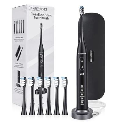 Personalised Sonic Clean for Every Smile: Choose from five brushing modes and three intensity levels to match your needs: daily cleaning, polishing, or extra-gentle gum care. Adjust easily with the Mode button for a comfortable, customised brushing experience. Smart Pressure-Sensor Protection: Built-in pressure sensor detects when you brush too hard and automatically vibrates and flashes to alert you. Helps prevent over-brushing and protects enamel and gums from excess pressure. Smart Two-Minute Timer: A built-in 2-minute timer encourages dentist recommended brushing time and powers off automatically when your cleaning cycle is complete ensuring a consistent, effective routine every day. Extended battery life: Enjoy up to 180 days of use per charge (varies by mode and intensity). Simply place the handle on the USB charging base (5V) and use the mode lights to check remaining battery power. Compact & Travel-Ready with Storage Case: Designed for convenience, this electric toothbrush comes with a durable case that keeps the handle and brush heads neatly arranged and protected perfect for maintaining a clean, healthy smile wherever you go. Effortless Hygiene Maintenance + IPX8 Waterproof: Fading indicator bristles remind you when it’s time to replace the brush head about every three months. The quick click-on system makes swapping heads fast and secure, and the IPX8 waterproof design ensures safe, reliable use in any bathroom setting. Complete adult kit: The BarberBoss electric toothbrush includes 6 brush heads: 4 Standard with medium DuPont bristles for everyday cleaning and 2 Mini heads with a soft silicone guard for precision in hard-to-reach areas. Comes with a protective travel case for convenience on the go.