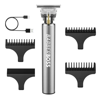 BARBERBOSS T Blade Beard & Hair Trimmer for Men, Cordless Detail Clipper, Rechargeable Groomer with 3 Guide Combs, Precision Grooming Beard, Sideburns Neckline, Silver Grey