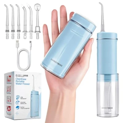 All-in-one nozzle kit for Complete Oral Care: The Barberboss travel oral irrigator includes six precision tips (3* Standard for routine cleaning, 1* Orthodontic for braces, 1* Periodontal for below-gum care, and 1* Tongue Cleaner for fresher breath). One-touch release makes changing tips quick, hygienic, and effortless. IPX8 Waterproof Water Flosser with Compact, Leak-Safe Tank: The detachable water tank is easy to fill, clean, and securely sealed to prevent drips or leaks in your bag or wash kit. Durable, travel-friendly, and fully waterproof for convenient, hygienic use wherever you go. Compact Power for Everyday Confidence: The BarberBoss blue travel water flosser delivers a powerful yet gentle clean, effectively removing debris between teeth and below the gumline. Compact, cordless, and refreshingly easy to use, it’s perfect for maintaining a confident, healthy smile at home or on the go. Three intensity choices: Switch easily between Gentle, Standard, and Pulse settings to match your comfort level. The responsive Mode button and bright LED display guide you through each option for effortless control. Smart 1-Minute Timer for Efficient Flossing: An intelligent auto-stop timer helps you floss for the recommended duration. The flosser automatically pauses after one minute, or you can stop manually at any time for complete control. Long battery, quick recharge: Use continuously for up to 50 days per full charge (depending on mode). Recharge conveniently through the USB-C port via adapter, laptop, or power bank. LED indicators keep you informed of charging and battery status.