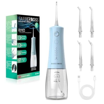Comprehensive Oral Care with 4 Versatile Jet Tips: The BarberBoss Water Flosser kit contains 2 Standard Tips, 1 Orthodontic Tip, and 1 Periodontal Tip, providing a variety of options for teeth cleaning, maintaining braces, and gum care. 5 Adjustable Pressure Levels for Customized Cleaning: Select from 5 tailored pressure settings - Soft, Medium, Strong, Custom, and Jet designed to meet your specific oral care needs. Whether you're seeking gentle gum care or a deep clean to remove food particles and stubborn buildup, this flosser deliver optimal results for your oral hygiene. High-Capacity 340ML Tank: Designed for convenience, the spacious 340ML water tank allows for a complete flossing routine in one go, no interruptions, no constant refilling. Its detachable, wide-mouth design makes refilling effortless and helps maintain hygiene with easy cleaning. 360° Gravity Ball Design for Multi-Angle Flossing: This water flosser incorporates a cutting-edge 360° gravity ball mechanism and rotatable tips, ensuring a steady, smooth water flow from any direction - even upside down. With the ability to easily adjust the tips, you can effortlessly target tight spaces, back teeth, and other difficult-to-reach areas, delivering a gentle yet effective clean that removes oral debris while being kind to your gums. Shower-Friendly with IPX8 Waterproof Rating: Built with an IPX8 waterproof rating, the BarberBoss Portable Dental Flosser is completely safe to use in the shower. Its water-resistant durable design lets you floss comfortably and confidently in wet environments, without worry of water damage. Long Battery Life with USB Charging Convenience: Powered by a robust rechargeable battery, this cordless dental flosser offers up to 60 days of continuous use after just 6 hours of charging. It comes with a versatile USB-C charging cable, compatible with laptops, power banks, and USB-C wall plugs, making it easy to maintain oral hygiene while on the go.