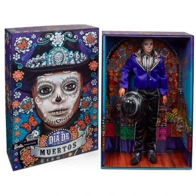 Celebrate Día De Muertos 2023 with a collectible Barbie doll! Ken wears a satin suit that pays homage to the traditions, symbols and rituals of this time-honored holiday. Ken doll commemorates the occasion dressed in a dark blue jacket with embroidered sugar skull and bone details on the lapels. A stunning sugar skull band wraps around his hat and accentuates his intricate calavera face paint. A silvery striped undershirt, elegant trousers and matching black boots complete his sophisticated ensemble. The 2023 Barbie Ken Día De Muertos doll comes in deluxe packaging and is perfect for display and gifting. May he fill your holiday with joy as you celebrate the memories of loved ones!, Manufacturer: Mattel